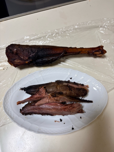 スネをかじる 2026-02-28 03:08:38 獣肉の食用部位で人気なのは胴体(胸からお尻)と後ろ足のモモ肉です。前足やスネ肉、頭や首は硬かったり筋が多くてあまり好まれません。そういった部位は煮込みやミンチ、ジャーキーや出汁になります。ですが丁寧にじっくり燻製にするとビールやワインのお供にぴったりなつまみになります!そのままでも、サラダにしても、パンに挟んでも美味しい!(写真は雌鹿のスネ)つまみ喰いにも!